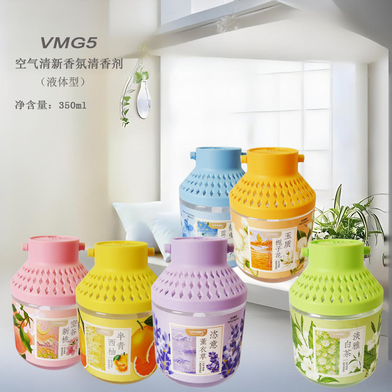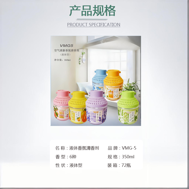 品牌: VMG5 货号: VMG-24011-24016产地: 广东揭阳市 功能: 空气清新 空气清香 空气净化芳香 吸附祛除异味 香型: 香桃 栀子花 白茶 西柚 薰衣草 蓝风铃香型 箱装数量: 72瓶/箱 物理形态: 液体型 净含量: 350ml/瓶